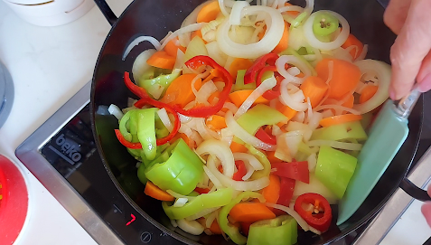 U šerpu sipati oko 30 ml ulja i ubaviti na rezance crni luk, na kolutove šargarepu, i na krugove papriku.