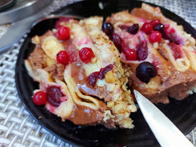 Svaku palačinku premazati svetlim pudingom pa ubaciti šaku voća i saviti sa jedne i druge strane, pa presaviti u paketić. Ređati u pleh u koji će se seći. - Na prvi red paketića staviti malo čokoladnog pudinga, pa opet punjene palačinke do utroška. Odozgo premazati ostatkom čokoladnog pudinga, posuti malo seckanim orasima i voćem. Staviti da se dobro ohladi i služiti.