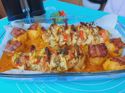 U proreze stavljajte listiće belog luka, paprike, kačkavalja suve slanine. U činuji izmešajte ulje, majonez, senf, soja sos, papriku slatku i tucanu, so i biber.