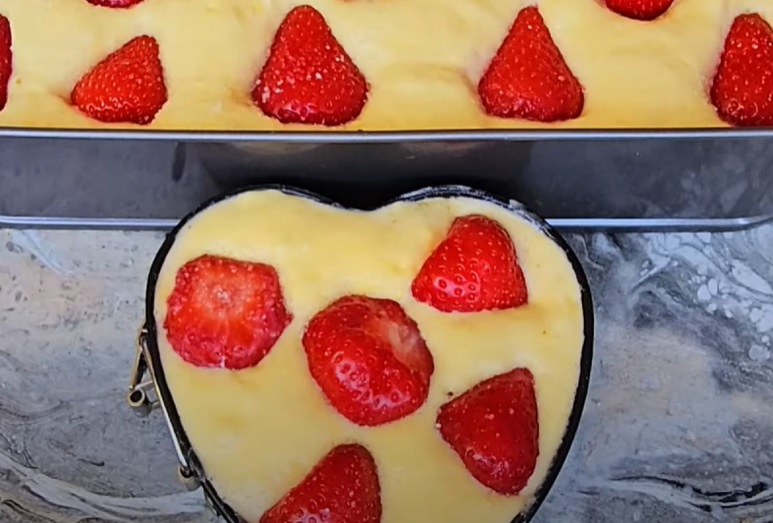Sipati testo, pa poređati jagode. Ako su krupne iseći na pola.