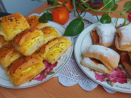 Testo iseći na kvadrate, pa u sredinu ubaciti po kašičicu sira i preklopiti kao salčiće. Ostaviti par komada, pa staviti kao nadev džema.