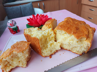 Manji pleh 23x13 cm obložiti pek papirom ili premazati uljem i izliti testo. Peći na 210 stepeni C oko 40-50 min. Pokriti krpom da se ohladi.