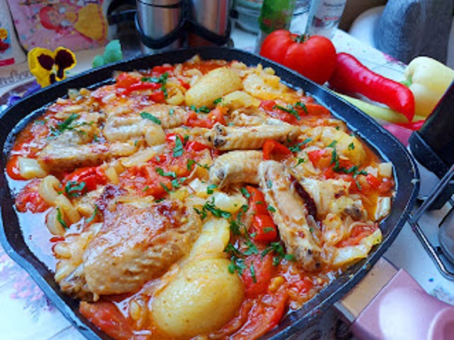 - Kad se krilca isprže, dodati preko njih prženu papriku. Oguliti paradajz iseći na kocke i ubaciti.