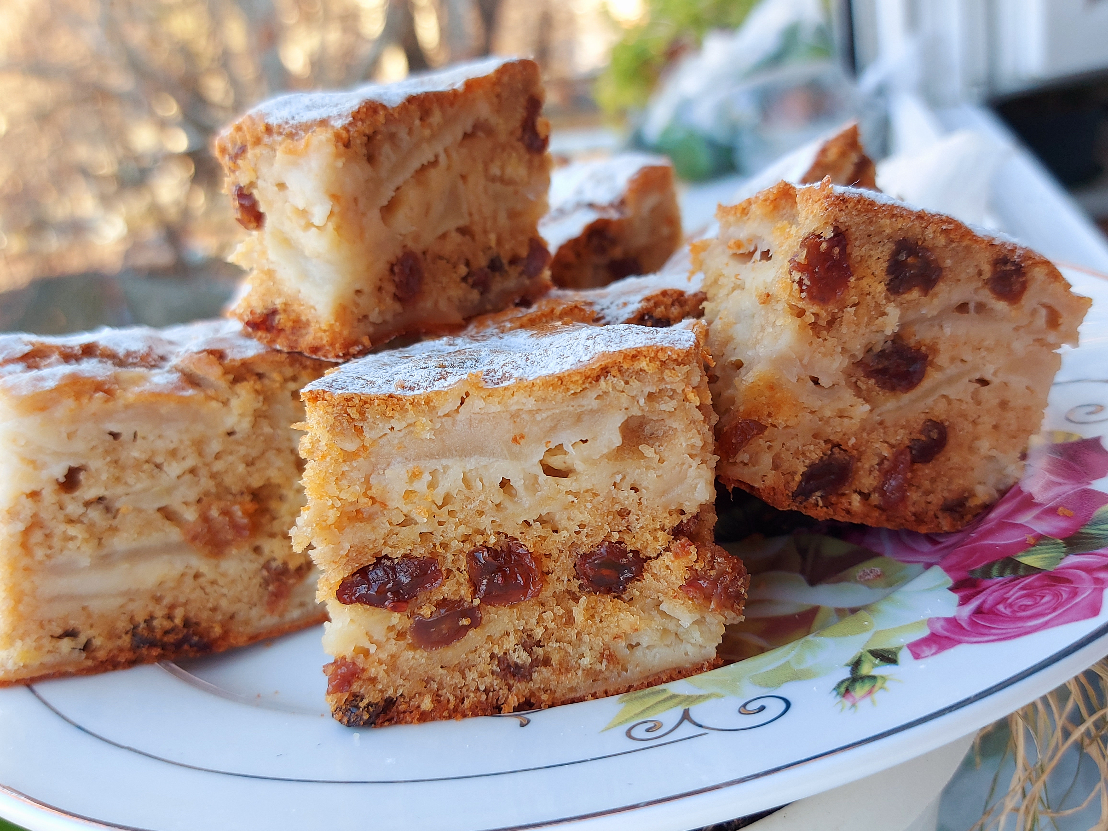 Pleh 24 cm obložiti pek papirom pa izliti testo i izravnati. Peći na 200 stepeni C 50 minuta. Ohlađen seći. Posuti prah šećerom.