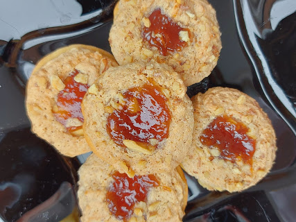 Dodati mlevene orahe i 1 malu kašičicu brašna. Sve izjednačiti dobro i puniti špric. Malom kašičicom vaditi džem i stavljati na sredinu kolačića u plehu.