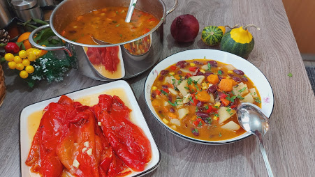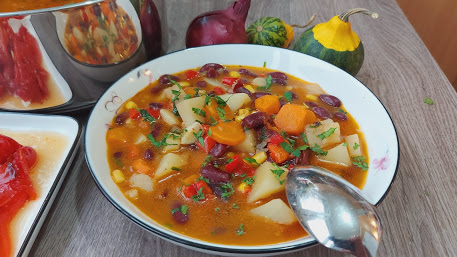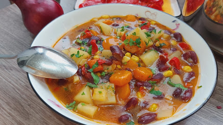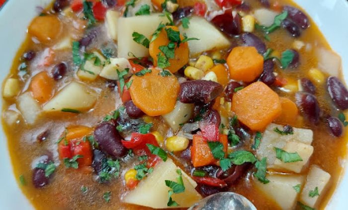 Iseckati luk, papriku, šargarepu, celer, ako imate karfiol cvetove i sve dobro predinstati na ulju da omekne. Dodati crvenu papriku, biber, sečene kockice krompira, celer, kuvan pasulj i kukuruz.