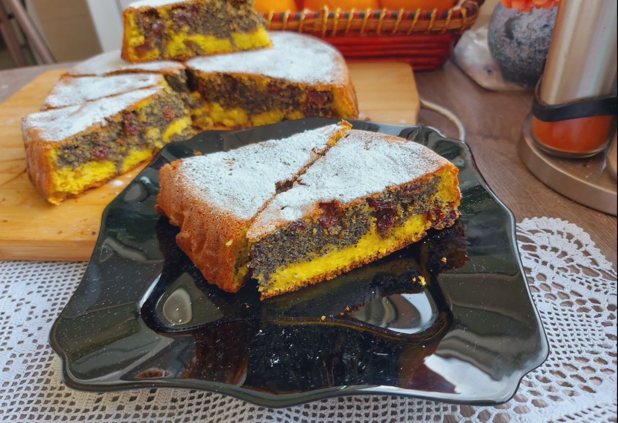 U ostali deo testa dodati mleveni mak, zatim suvo grožđe malo cimeta i izmešati lagano. Sipati na svetli deo u plehu i rasporediti kašikom.