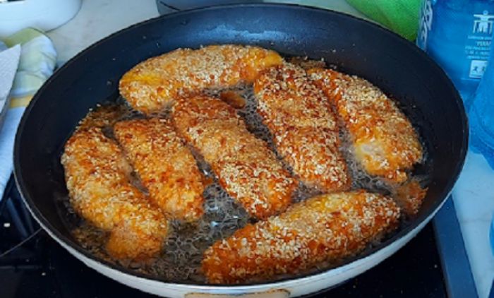 - Uvaljati u brašno, jaja, prezle i susam izmešan sa sojinim pahuljicama...Pržiti u dubokom ulju poklopljeno da porumeni.