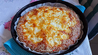 Testo istresti u tepsiju i brašnjavim rukama ga poravnati na veličinu prečnika 30 cm, prema tepsiji. Izmešati oba sira.