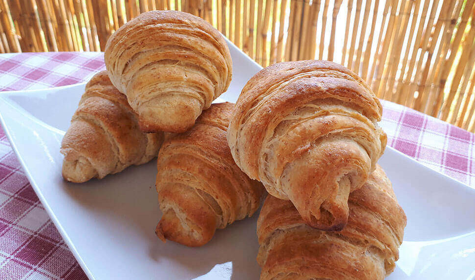 Gornje delove trouglova malo zasecite, i rolajte kao na slici. Kroasane stavite u pleh,ostavite ih 15 minuta da nadođu. Pre pečenja premažite ih sa mešavinom maslinovog ulja i mleka.