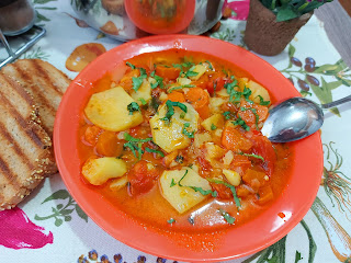 Ubaciti krompir i naliti vode da omekša krompir i skuvati da se kromoir skuva. Dodati oljušten paradajz na kockice.