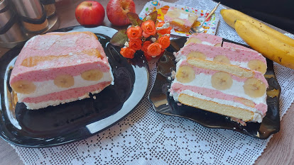 Uzan pleh obložiti prozirnom folijom, pa na dno poređati umočene piškote u sok.