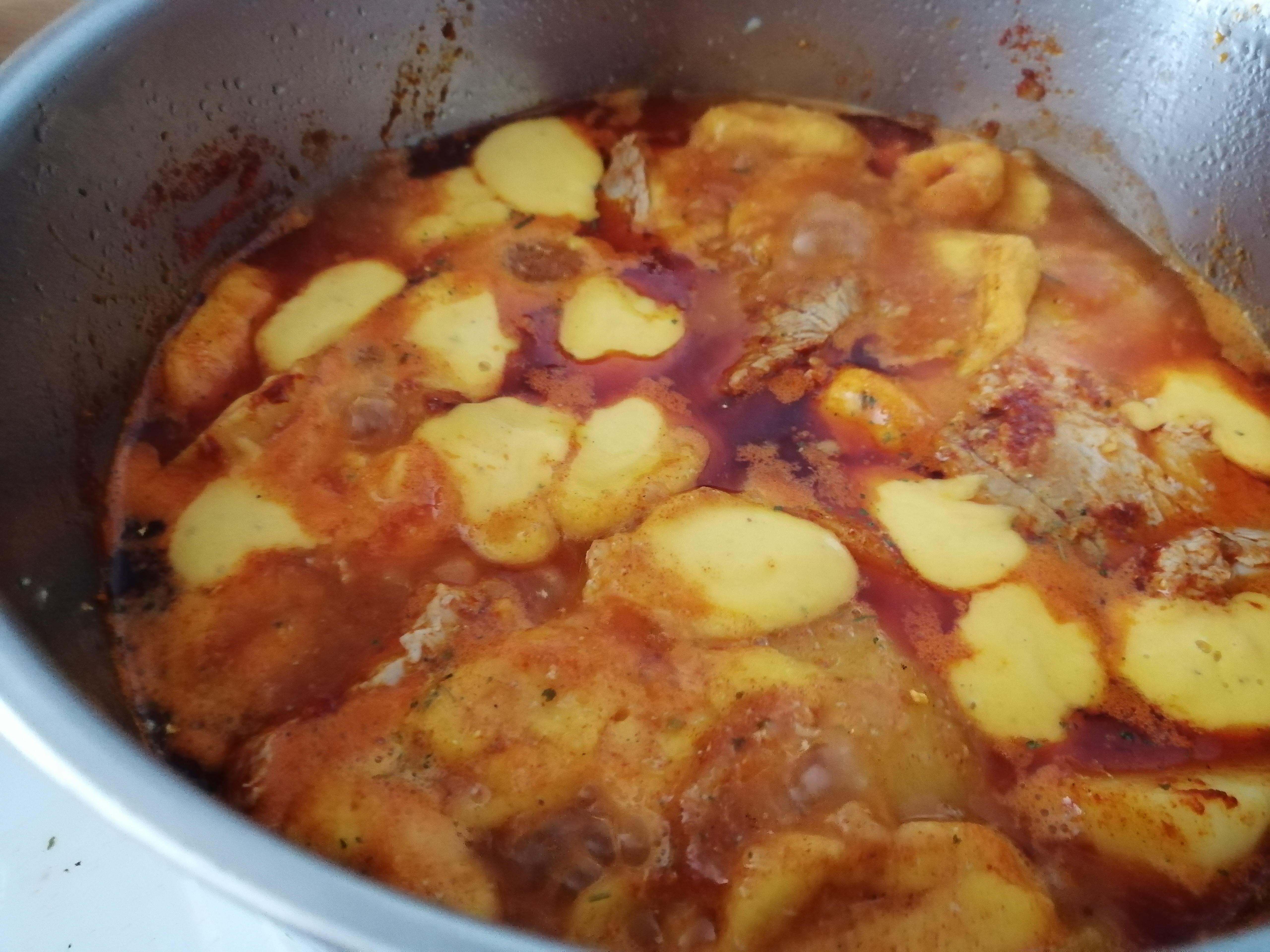 Krompir se oljušti i iseče na četiri dela (kriške) i ubaci sa mesom. Kada krompir malo omekne dodaju se tri kašikice crvene paprike. Kada se kratko prodinsta, nalije se toplom vodom da ogrezne.