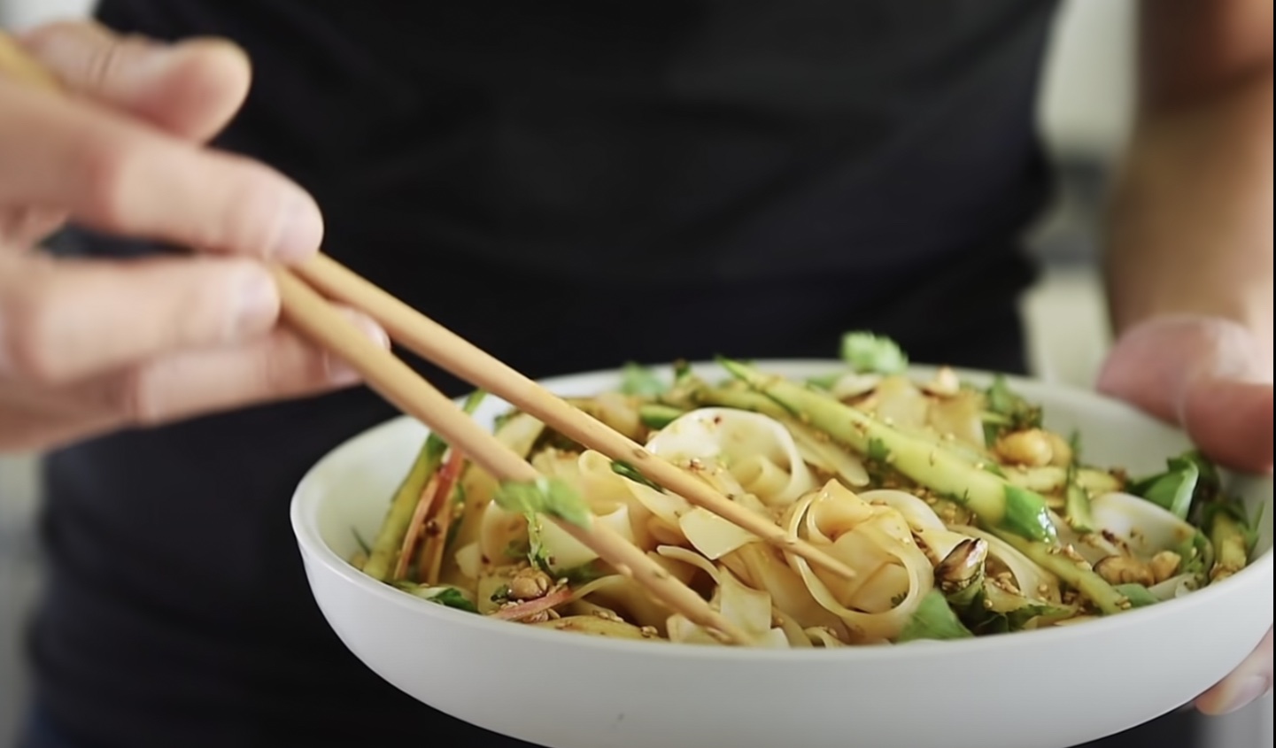 Pomešajte sve sastojke za dresing zajedno u velikoj posudi, a zatim umešajte luk. U međuvremenu, kuvajte rezance u loncu sa ključalom vodom 5 minuta, dodajući grašak na pola vremena kuvanja – rezanci i grašak treba da budu samo malo omekšani. Ocedite, ohladite pod tekućom hladnom vodom i ponovo ocedite.