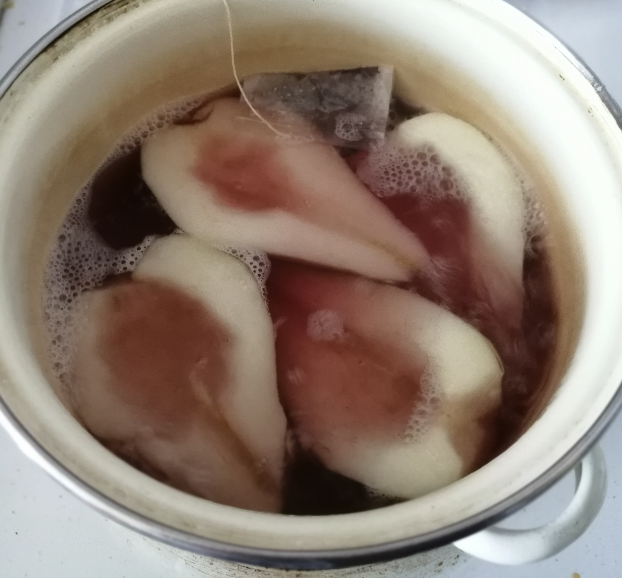 Kruške se oljušte, prepolove i očisti se sredina. Umešne domaćice mogu da očiste sredinu, a da sačuvaju oblik čitave kruške i mogu da ih pune poput tufahija. U šerpu se sipa kašika šećera, stave kruške i doda kesica čaja od hibiskusa. Čaj od hibiskusa će kruškama dati lepu crvenu boju.