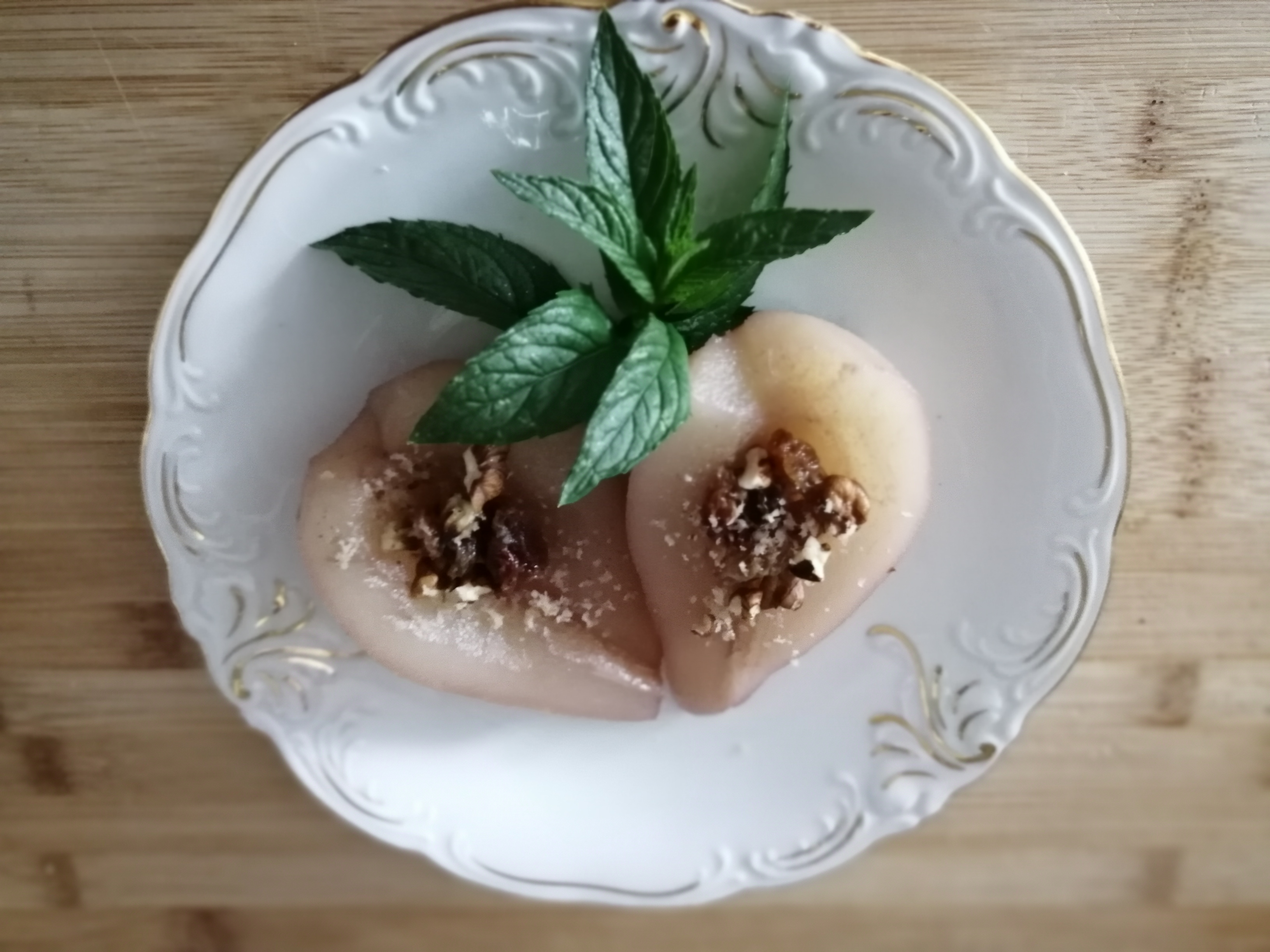 Preko kruške može da se prelije sos od vanile ili šlag, kao i listići nane koji će dati svežinu slatkišu.