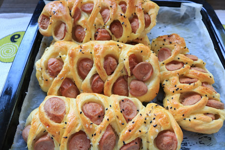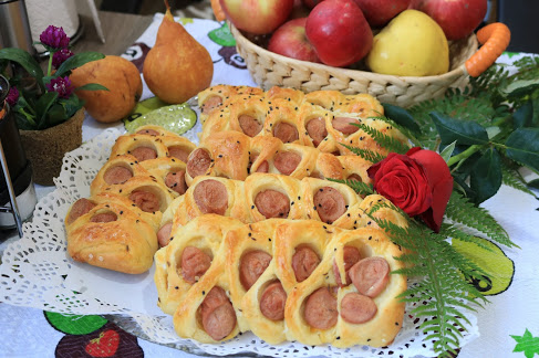 U svaki deo uviti po jednu viršlu, a zatim oštrim makazama odozgo zaseći nakoso testo i viršlu tako da se preseku viršle.