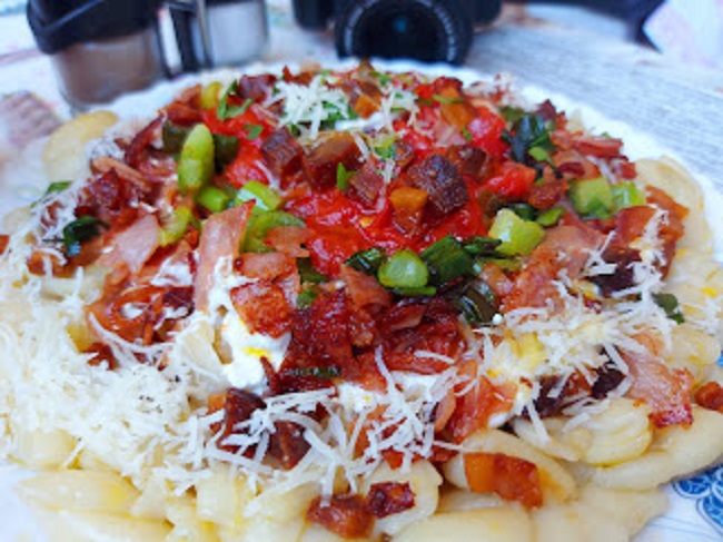 - U masnoću ispržiti seckanu na kockice šunku, pa i nju staviti po testenini. Na istoj ispržiti seckan luk i na kraju paradajz na kockice. Sve sipati u krug jedan do drugog.