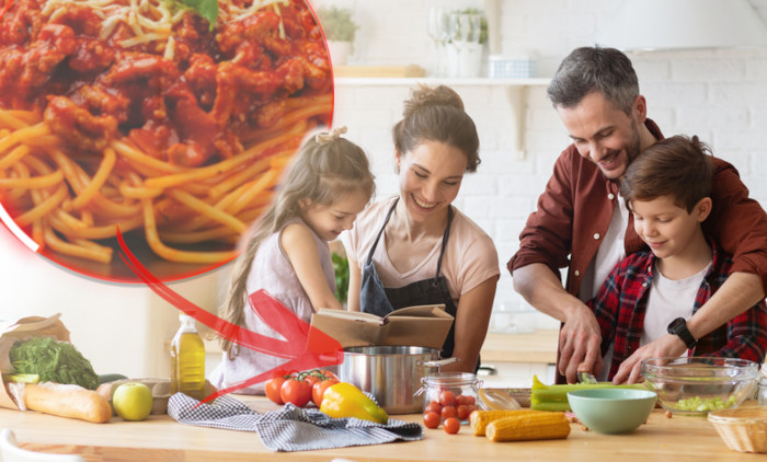 POTREBNO JE: 350 g mešanog mlevenog mesa, 400 g špageta ili makarona, 500 ml kuvanog paradajza,1 čen belog luka, 2 srednja luka, ulje, origano, so, biber
