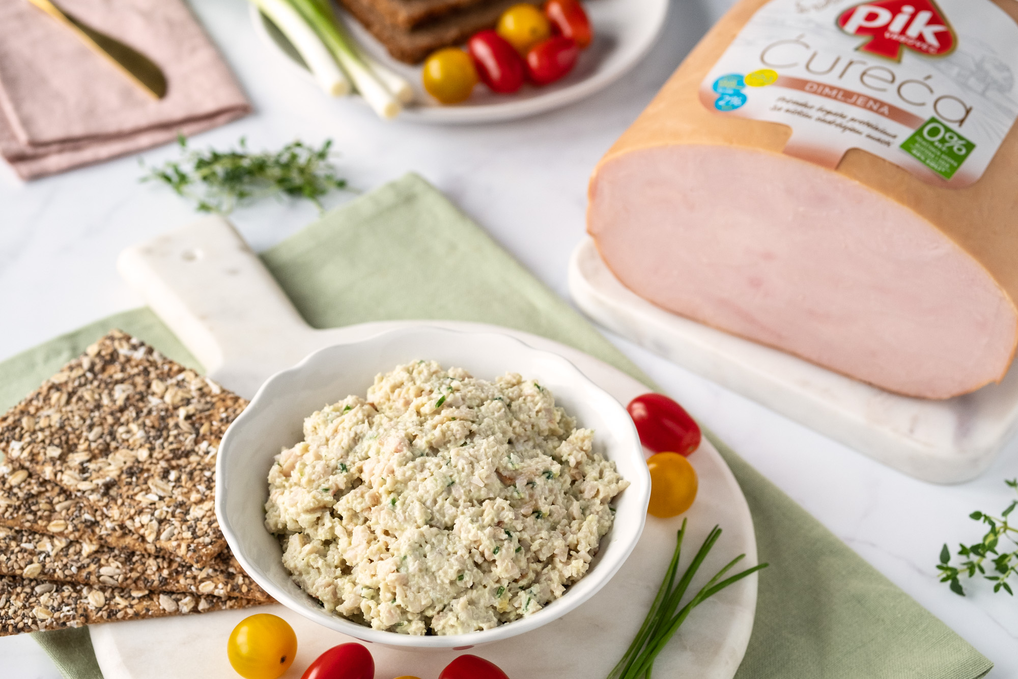 PIK Ćureća dimljena prsa iseckajte na sitne komade, najbolje pomoću seckalice. Dodajte posni sir, avokado majonez i sveži vlašac te sve dobro promešajte. Namaz poslužite na ražanom hlebu ili integralnim krekerima, a po želji, ukrasite svežim povrćem i začinima.