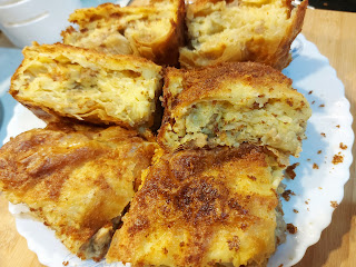 Posoliti, dodati mleveni biber...Jaja umutiti mikserom, dodati ulja 50 ml jogurta, mleko, griz i sve izjednačiti. Tanke kore ređati, prvo dve premazati uljem, na trećoj ide nadev, a zatim na svaku koru po malo nadeva.