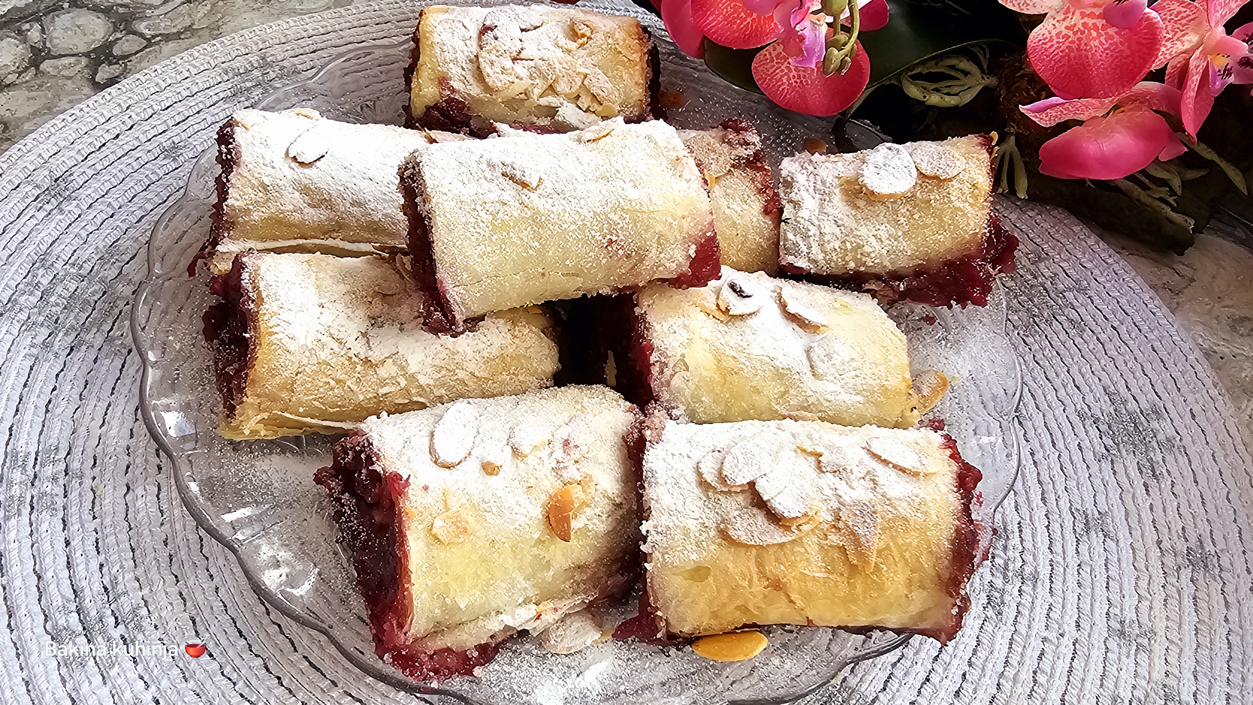 Na petu koru pri dnu staviti pola višanja, pa uviti u rolat. Tako i drugi rolat. Rolate premazati uljem i posuti listićima badema.