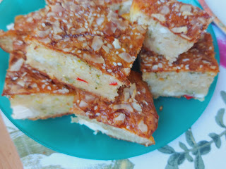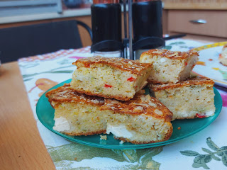 Sve izjednačiti i istresti u podmazan pleh od 22 cm ili koji želite. Poravnati i peći na 200 stepeni C 50 min da lepo zarumeni i tečnost ispari. Prohlađenu seći. Odlična kao pređelo, užina ili večera. Prijatno!