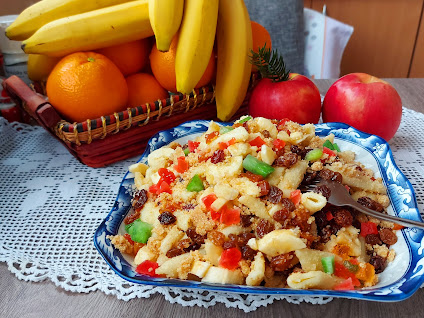 Dodati med i malo vode da griz upije. Sipati preko tastenine. Dodati suvo grožđe potopljeno u rum.