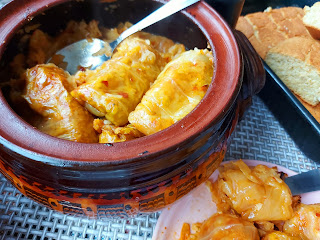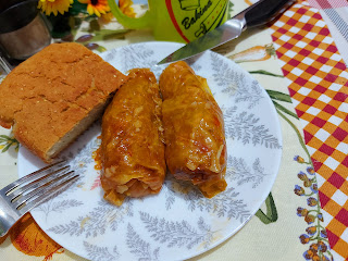 Dodati opran pirinač, i na kosckice seckan celer i krompir. Ubaciti sve začine, promešati i zavijati sarme. Ređati u zemljan lonac, dodati lovorov list i još malo tucane ljute paprike i ulja.
