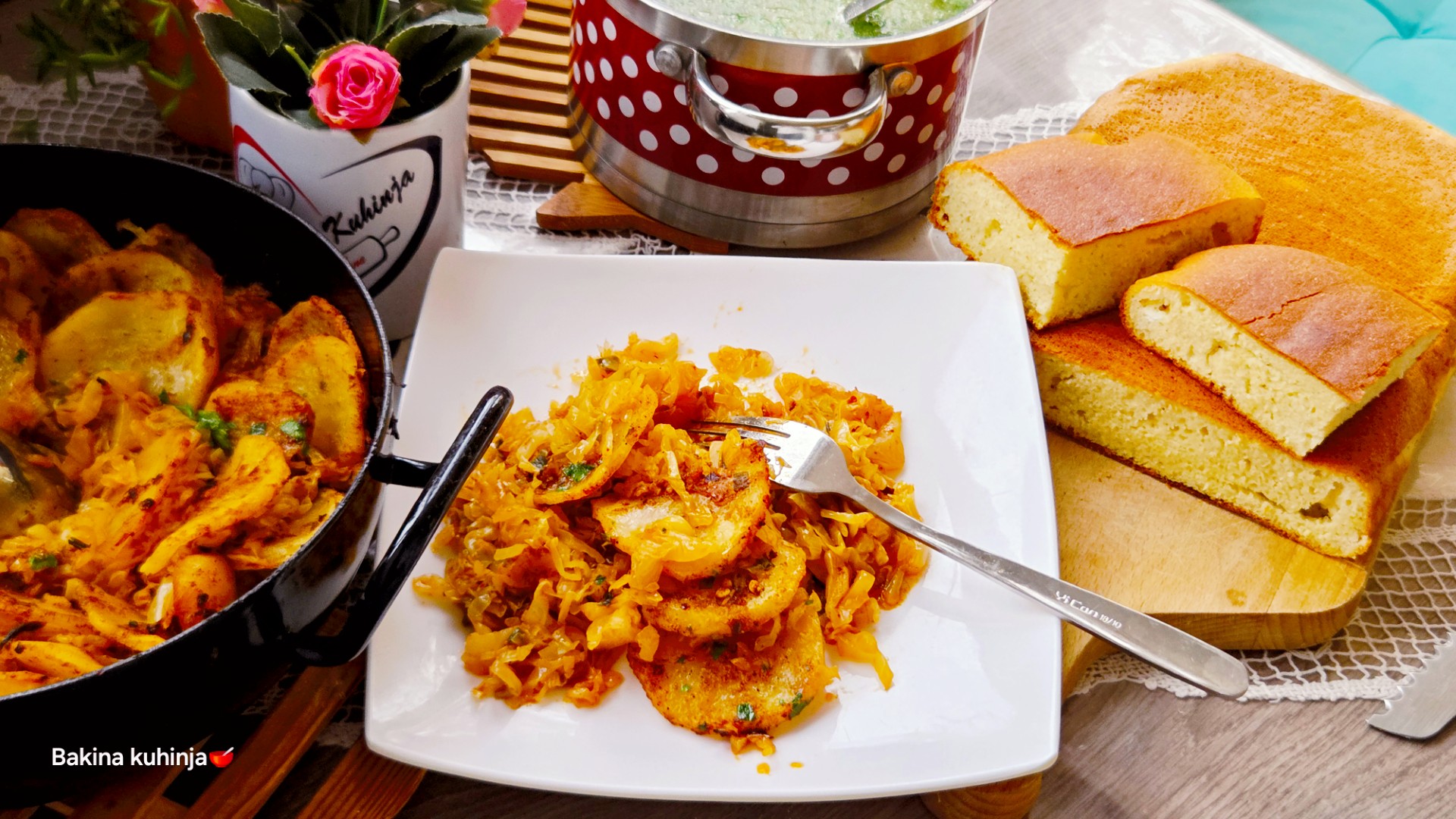 Posolite po ukusu. Poklopite i ostavite da se krčka na tihoj vatri dok tečnost ne uvri i kupus ne postane potpuno mekan. Pred sam kraj kuvanja, dodajte pola glavice seckanog belog luka i sve dobro izjednačite. Krompir isecite na kolutove, a zatim ga u šerpi pomešajte sa uljem, slatkom paprikom, ljutom paprikom, mlevenim biberom, granulama belog luka i solju.