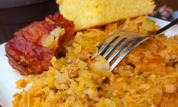 Dodati rebra, kiseli kupus, alevu papriku, mleveni biber i lovorov list. Sve izmešati, dodati vodu i dinstati sat vremena.