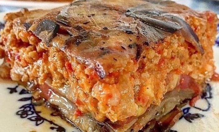 U tiganju propržite crni luk sa dva čena belog luka. Na malo maslinovog ulja propržite patlidžan. Proprženom luku dodate mleveno meso, začine i pržite sve dok meso ne bude gotovo. Nauljite vatrostalnu činiju. Vatrostalnu činiju obložite patlidžanom, dno i ivice posude tako da patlidžan viri spolja.