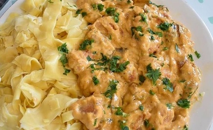 Piletinu isecite na kockice, pa uvaljajte u mešavinu paprike i brašna. Pržite je oko 5min. na zagrejanom ulju. Zatim je ubacite u pecčrke, luk, slaninu koje ste predhodno pržili. Sipajte 2 dcl vode i ostavite na tihu vatru oko 20 min. Pomešajte pavlaku za kuvanje sa brašnom, paprikom (ono sto vam je ostalo), dodajte kiselu pavlaku i rendan kačkavalj.