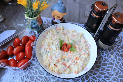 Dodati senf i majonez i sve dobro izjednačiti. Naša ruska salata je gotova. Uživajte!