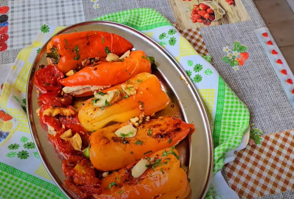 Paprike oprati pa iseći drške malo. Pri vrhu je malo raseći do pola pa upakovati listove šunke,sira kocke, paradajz može malo i kačkavalja, Ja sam stavila i listiće kulena.