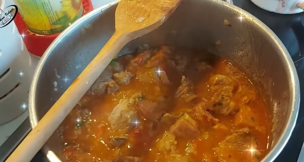 Dodati na meso iseckano na kocke, lovorov list i nekoliko zvna bibera, malo bujona ili vode. Poklopiti i dinstati na tihoj vatri oko 20 minuta bez mešanja samo protresti.