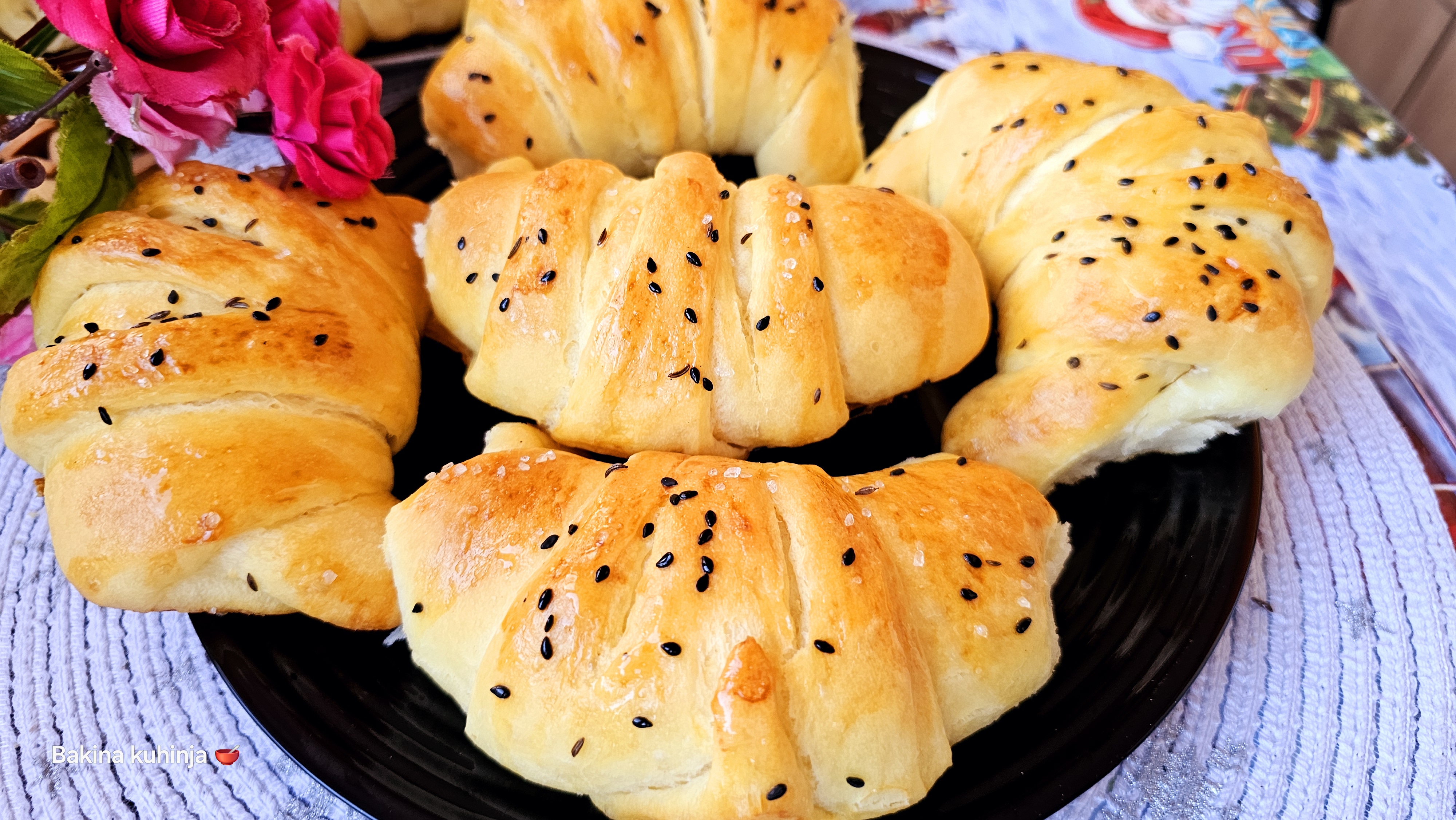 Na svaku kiflici malo margarina i pospite susamom. Pecite na 220 stepeni C 25-30 minuta. Prijatno!