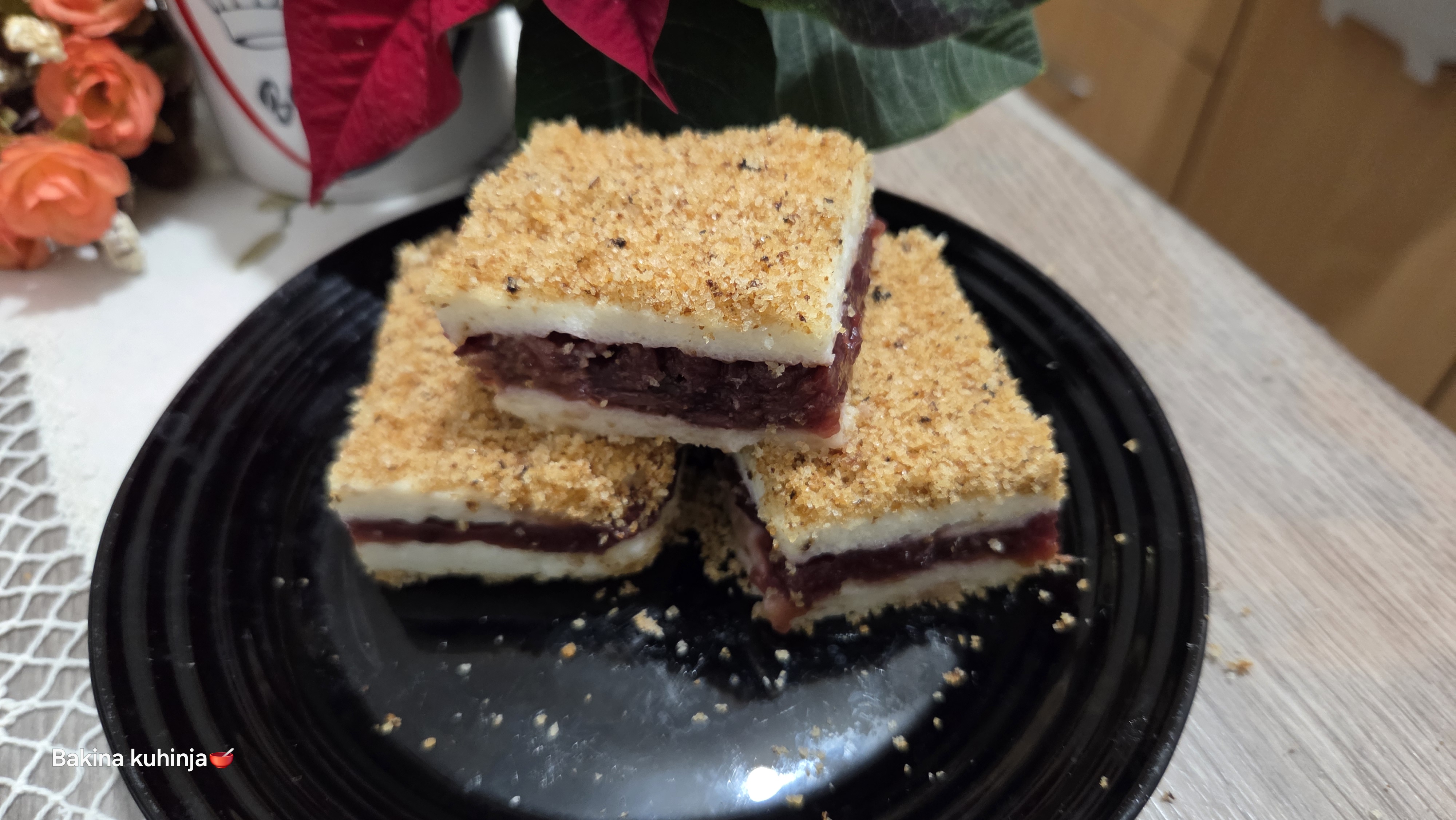 Griz mora da bude ređi. U manji poslušavnik na dno sipati pola prezli, pa pola griza i rasporediti. Sipati fil od šljiva ceo, pa fino špatulom razvući, a odozgo dodati drugi deo griza, pa ponovo izravnati.