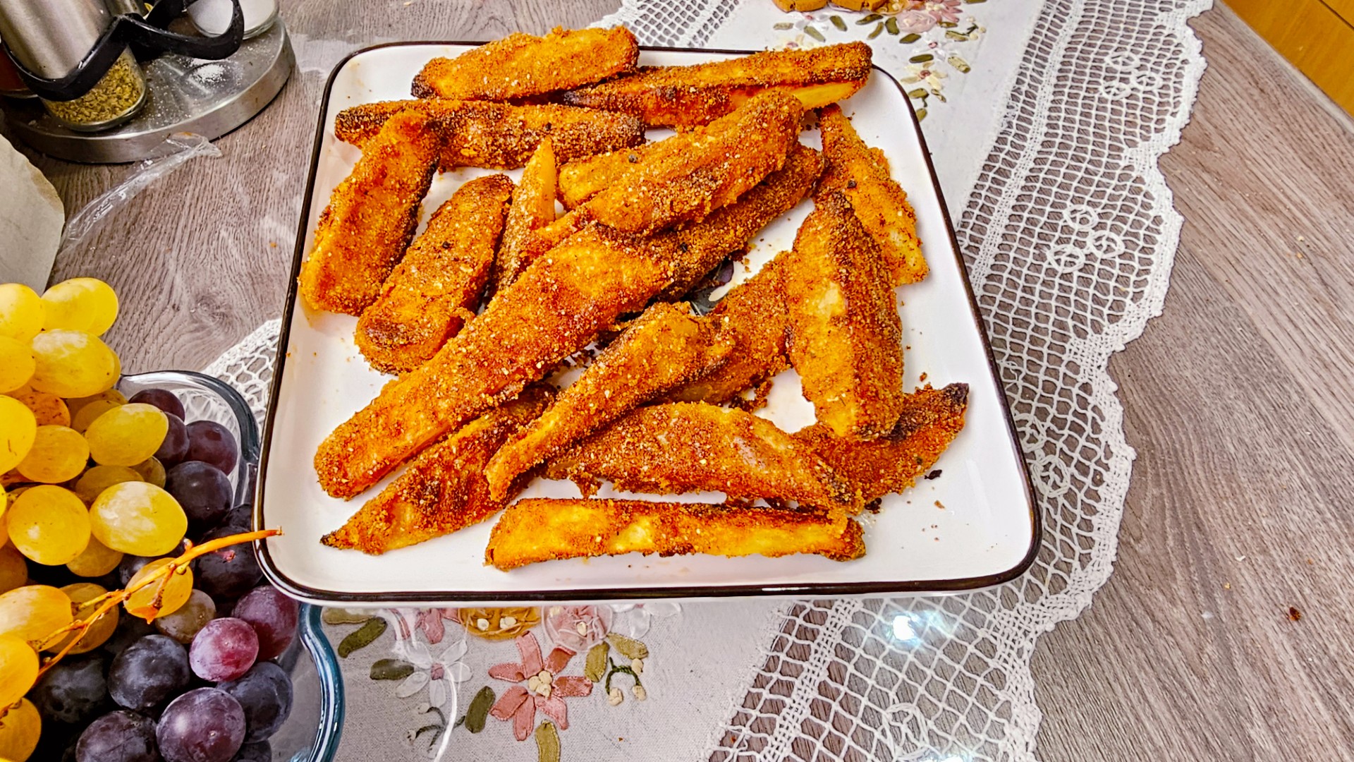 Poređati krompir i peći na 230 stepeni 30 minuta, pa okrenuti krompir špatulom da se peče još dok ne zarumeni. Služiti kao dodatak jelu ili kao grickalicu.