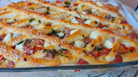 Dodati malo soli i 1 kašiku ulja. Umesiti testo i ostaviti da odmori. Odvojiti manji deo i pokriti, a ostatak iseći na veličinu tepsije. Na to sipati prženu šunku i rasporediti, pa dodati kocke sira.