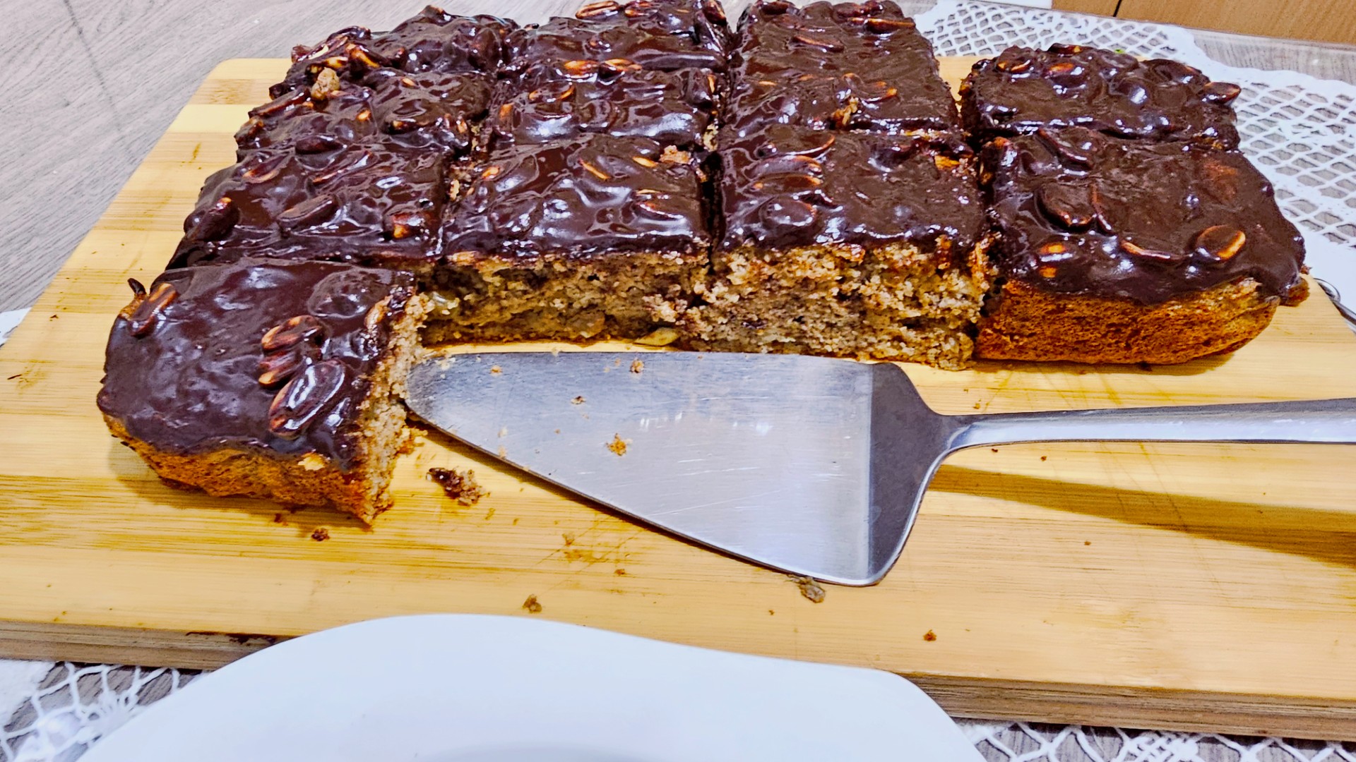 Umutiti jaja, dodati griz i prašak za pecivo prosejano, dodati mlevene orahe, mleko i ulje i sve izjednačiti. Dodati rendane jabuke sa cimetom i lepo izjednačiti.