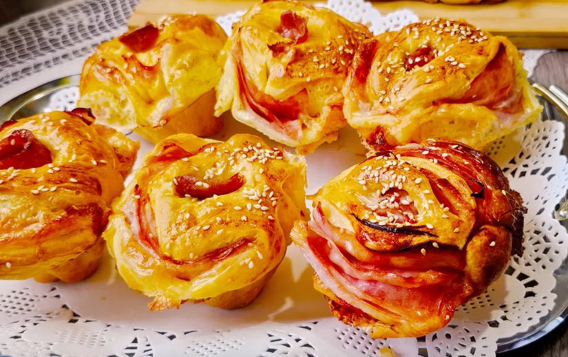 Svaku lopticu razviti tanko u krug, pa na sredinu staviti šunku i listove kačkavalja, saviti sa svih strana i prstima zatvoriti