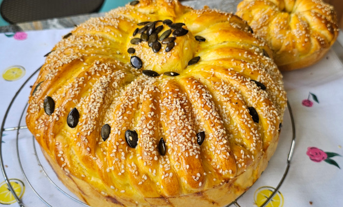 Pokriti da se udvostruči i premazati žumancetom u koji ste stavili dve kašike mleka. Posuti susamom i peći na 180 stepeni 50 minuta. Pokriti krpom da se ohladi i služiti. Uživajte!
