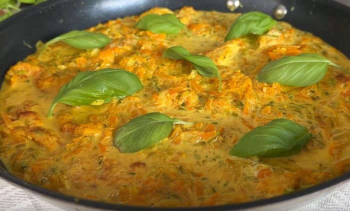 - Tikvicu i šargarepu izrendajte, pa dodajte u tiganj u kom se nalazi propržen crni luk. U isti tiganj dodajte bujon i poklopite. Kratko dinstajte, a potom dodajte kurkumu i slatku pavlaku. Sve dobro promešati.