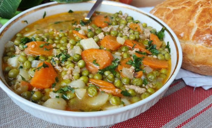Dodati grašak i krompir na kockice. Sipati vodu da ogrezne, pa kuvati tiho da se skuva i da voda uvri.