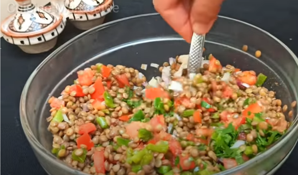 Prokuvati sočivo 10 minuta u vreloj vodi. Za to vreme, izgrilovati papriku i oljuštiti. Sve sastojke za salatu iseckati i staviti u istu posudu. Procediti sočivo i spojiti sa sastojcima. Začinite seđenim limunom, maslinovim uljem i sipati so, biber i kumin.Sve dobro pomešati i spremno je za serviranje.