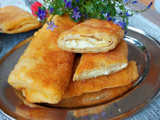 - Sir izdrobiti dodati žumance i izjednačiti .Palačinke ( mleko jaje brašno) ispeći pa svaku premazati sirom, saviti ivice presaviti dva puta.
