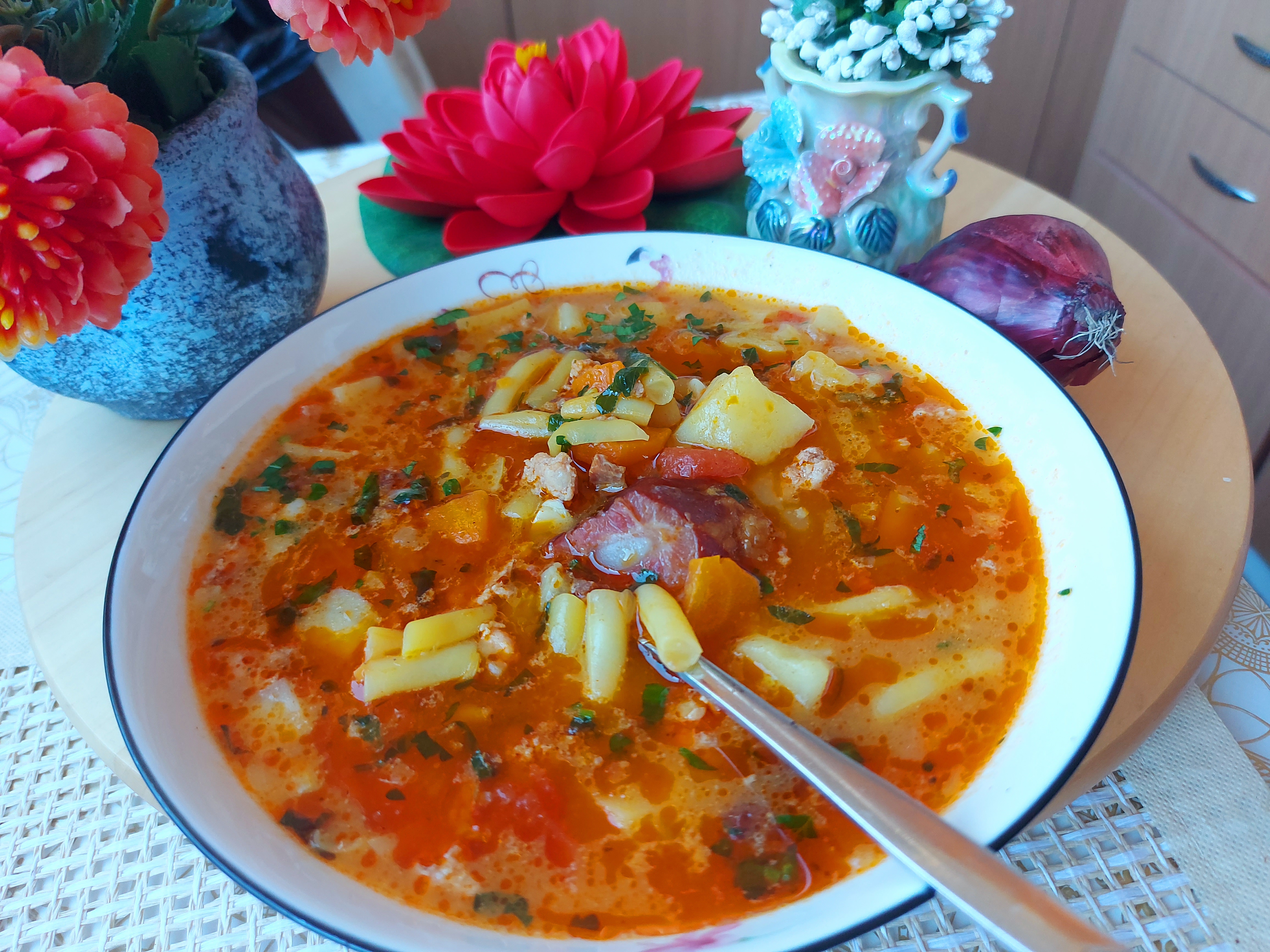 Iseckati suvu slaninu pa propržiti u to dodati seckan luk, papriku i šargarepu pa i njih propržit,i dodati im papriku crvenu i boraniju. Dodati i krompir na kockice.
