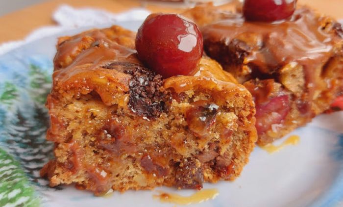 Suvo grožđe staviti u rastvor ruma. Jaja umutiti, dodati brašno i prašak za pecivo, otopljen maslac, seckane orahe, kockice čokolade, malo cimeta i suvo grožđe.