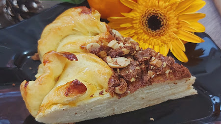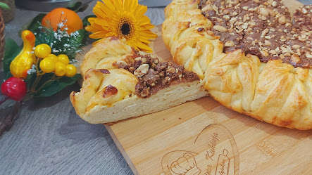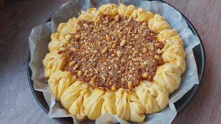 Pogaču staviti u tepsiju sa pek papirom. Sredinu napuniti kremom u koji ste ubacili krupno seckan kikiriki. Ostaviti da malo naraste pokrivena, pa premazati žumancetom, a onda naraslu pogaču-pitu peći na 180 stepeni C oko 40 min.